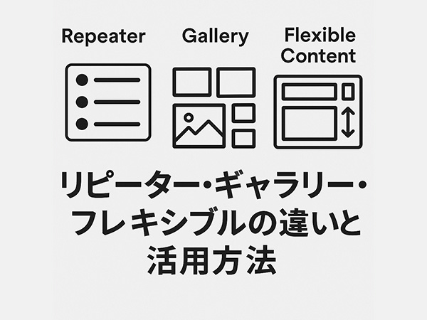 Webサイト制作でコンテンツの自由度を高めるために欠かせない「Advanced Custom Fields(ACF)」。中でも「リピーター」「ギャラリー」「フレキシブルコンテンツ」はよく使われる強力なフィールドタイプですが、使い分けを誤ると管理画面が煩雑になったり、表示が非効率になったりします。本記事ではそれぞれの特徴と使い分け方を実例とともに解説します。