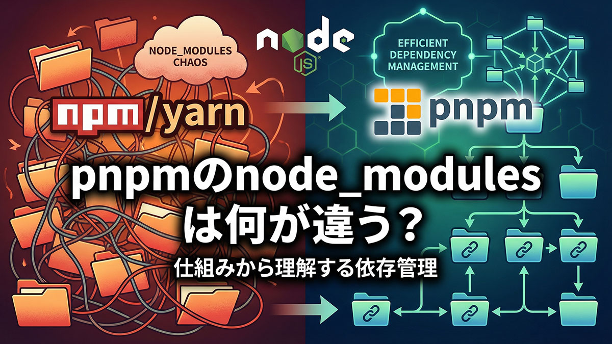 pnpmが「速い」「軽い」「戻れない」と言われる理由は、設定やコマンドではなく node_modules の構造そのもの にあります。npm や yarn と同じ JavaScript パッケージマネージャーでありながら、pnpm は依存関係の扱い方を根本から見直しました。本記事では、pnpm の node_modules が何をどう変えたのかを、内部構造と設計思想の観点から解説します。表面的な比較ではなく、「なぜこの仕組みなのか」を理解することで、pnpm を使うべき理由が見えてきます。