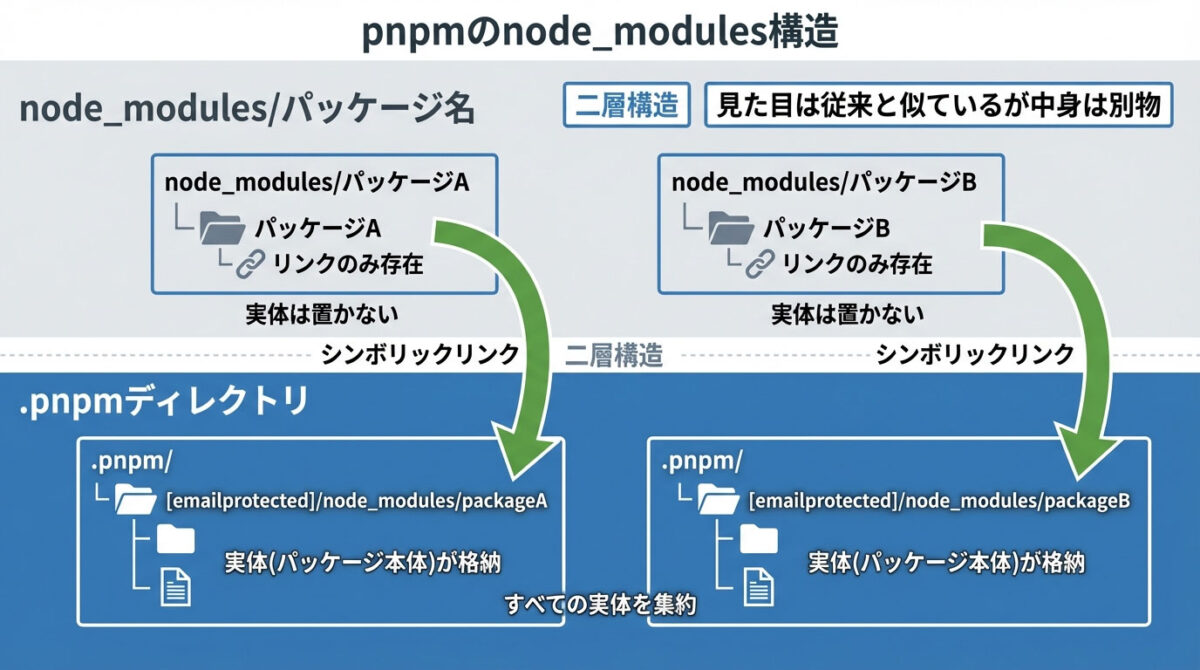 .pnpm:実体(パッケージ本体)が格納される場所node_modules/パッケージ名:リンクのみが存在する場所
