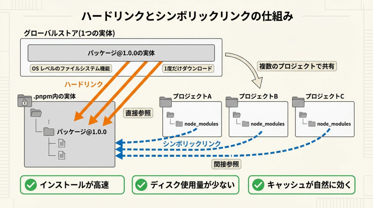 重要なのは、これは pnpm 独自の仕組みではなく、OS レベルのファイルシステム機能を活用している点です。ファイルシステムが同一であれば、複数のプロジェクトが同じ実体を安全に参照できます。
